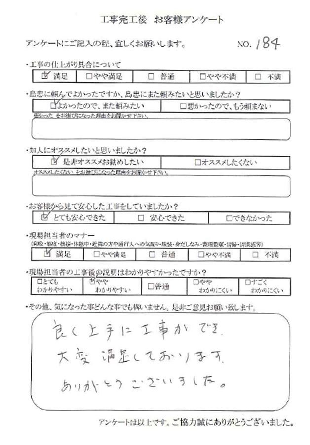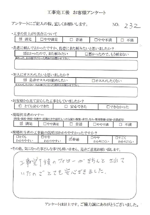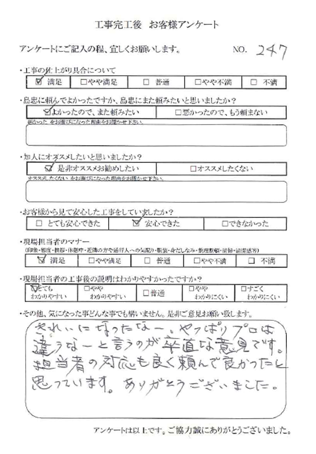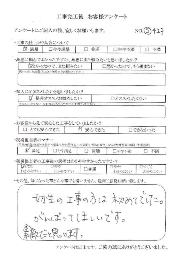 トラブルが起きないような工事にするのはもちろんですが、万が一何か問題が起こった場合もご安心ください。10年の工事保証が無料でついていますので、すぐにかけつけます。 |